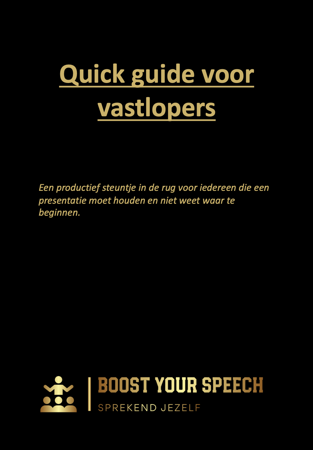 Dank je wel! Ik ga het kort houden, want je bent hier niet voor niets. Je bent vastgelopen in je voorbereiding voor een presentatie, dus je hebt geen tijd voor gedoe. Daarom hieronder meteen de button om het e-book 'Quick guide voor vastlopers' te downloaden.